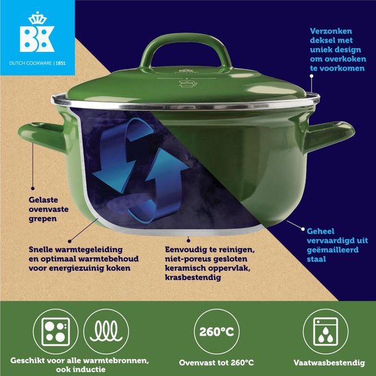 De BK Indigo steelpan met deksel Ø 16 cm is een compacte en veelzijdige pan met een inhoud van 1,2 liter. De pan is gemaakt van geëmailleerd staal, waardoor hij sterk, duurzaam en eenvoudig te reinigen is. Dankzij het klassieke ontwerp en de frisse groene kleur is deze steelpan een stijlvolle toevoeging aan iedere keuken. Geschikt voor alle warmtebronnen, inclusief inductie.